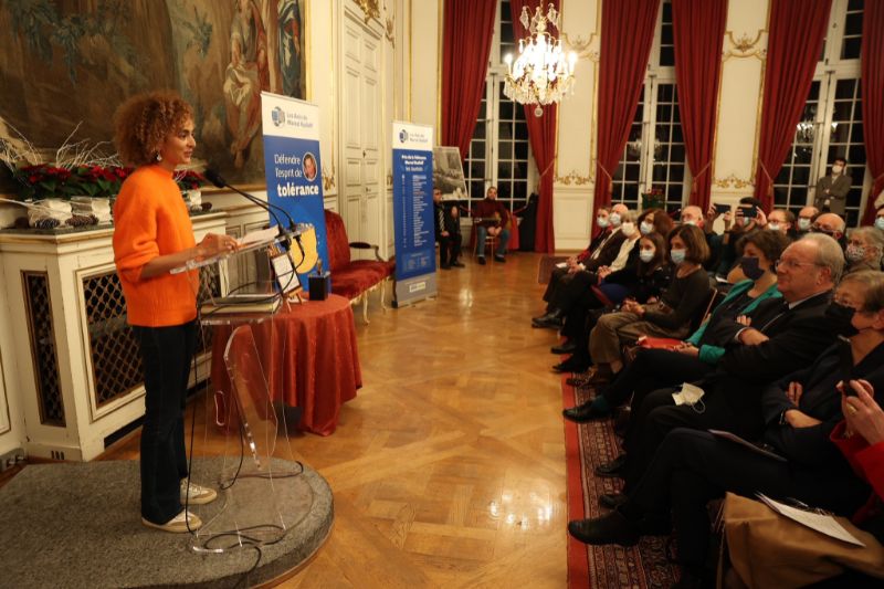 Leïla Slimani a reçu le Prix de la Tolérance Marcel Rudloff 2021, dans les salons de l’hôtel de ville de Strasbourg, le 19 novembre 2021.